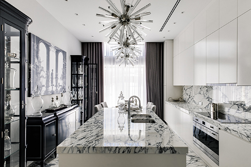 - главная лестница – мрамор Montana, - коридоры и холлы – сочетание двух видов мрамора: центральное панно и фризы из мрамора Daina Diagonale, фризы и внешний контур - мрамора Montana, - кухня – центральная часть напольного панно, рабочая столешница, фартук, подоконник и столешница острова выполнены из мрамора Daina Diagonale, обрамление панно – мрамор Montana, - портал камина – облицовка всех частей портала камина выполнена из мрамора Palissandro Bronze, - санузлы – отделка пола, стен и столешниц разными видами мрамора, такими как Daina Diagonale, Montana, Bedasar Brown, - бассейн – пол, плинтус и крышка перелива выполнены из итальянского мрамора Daina Diagonale.